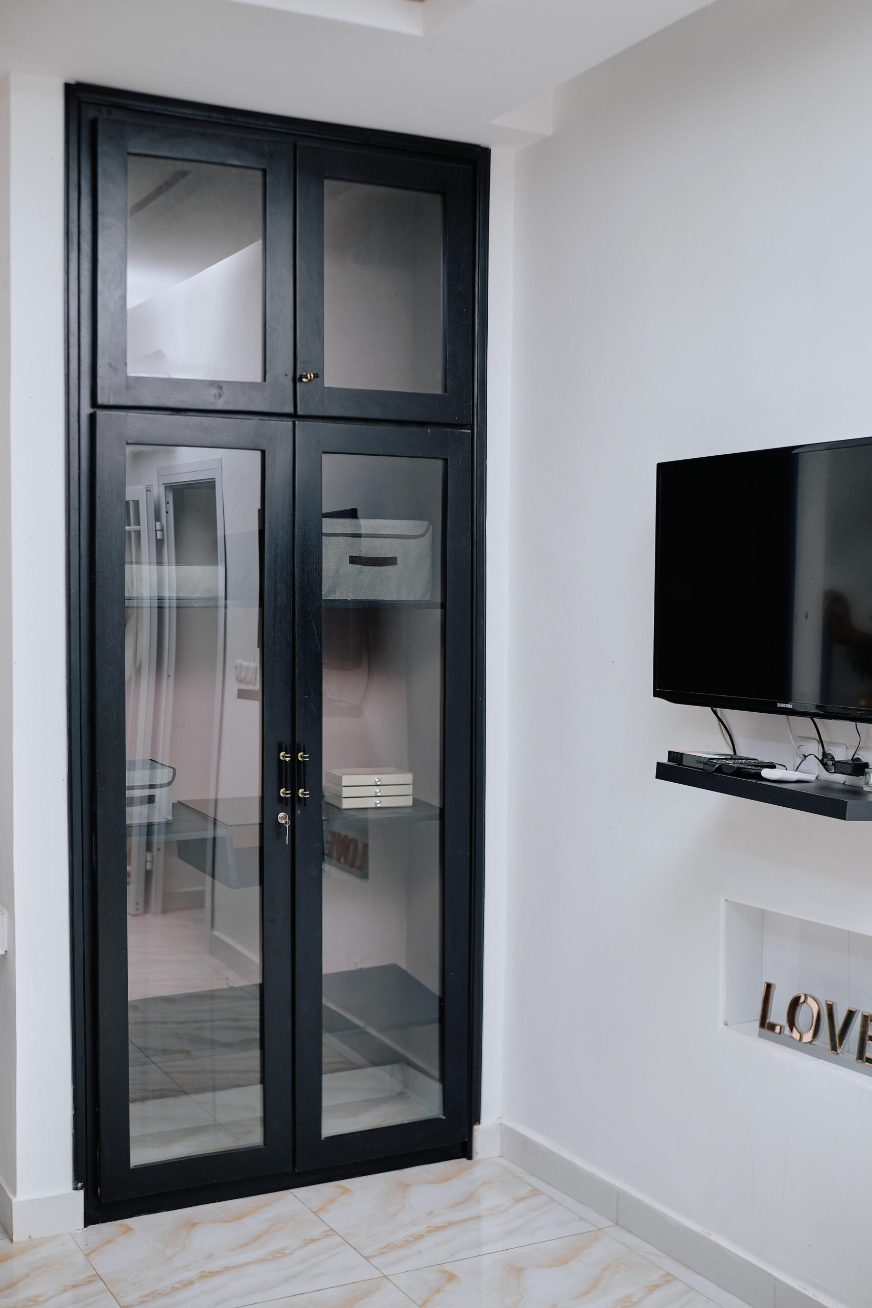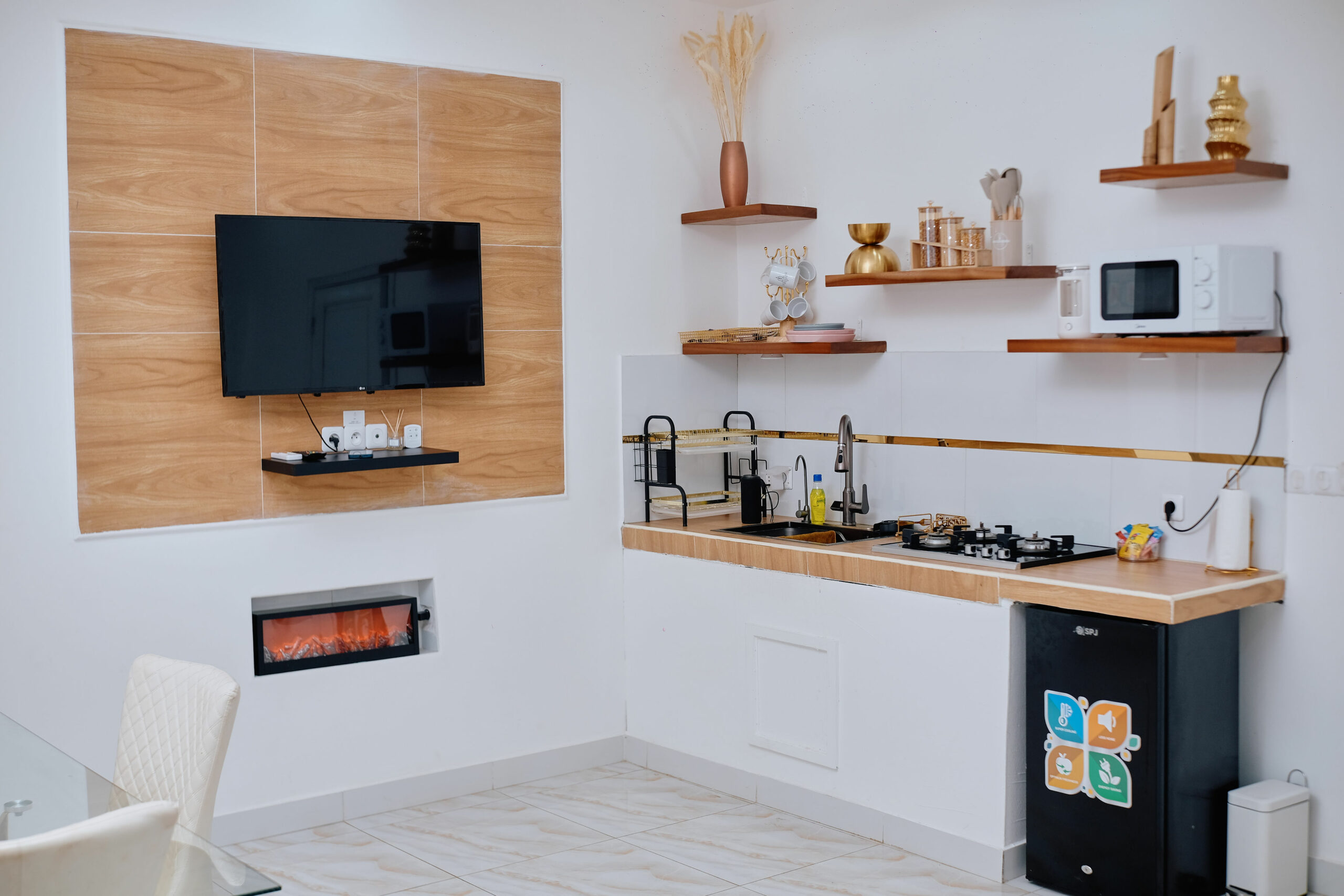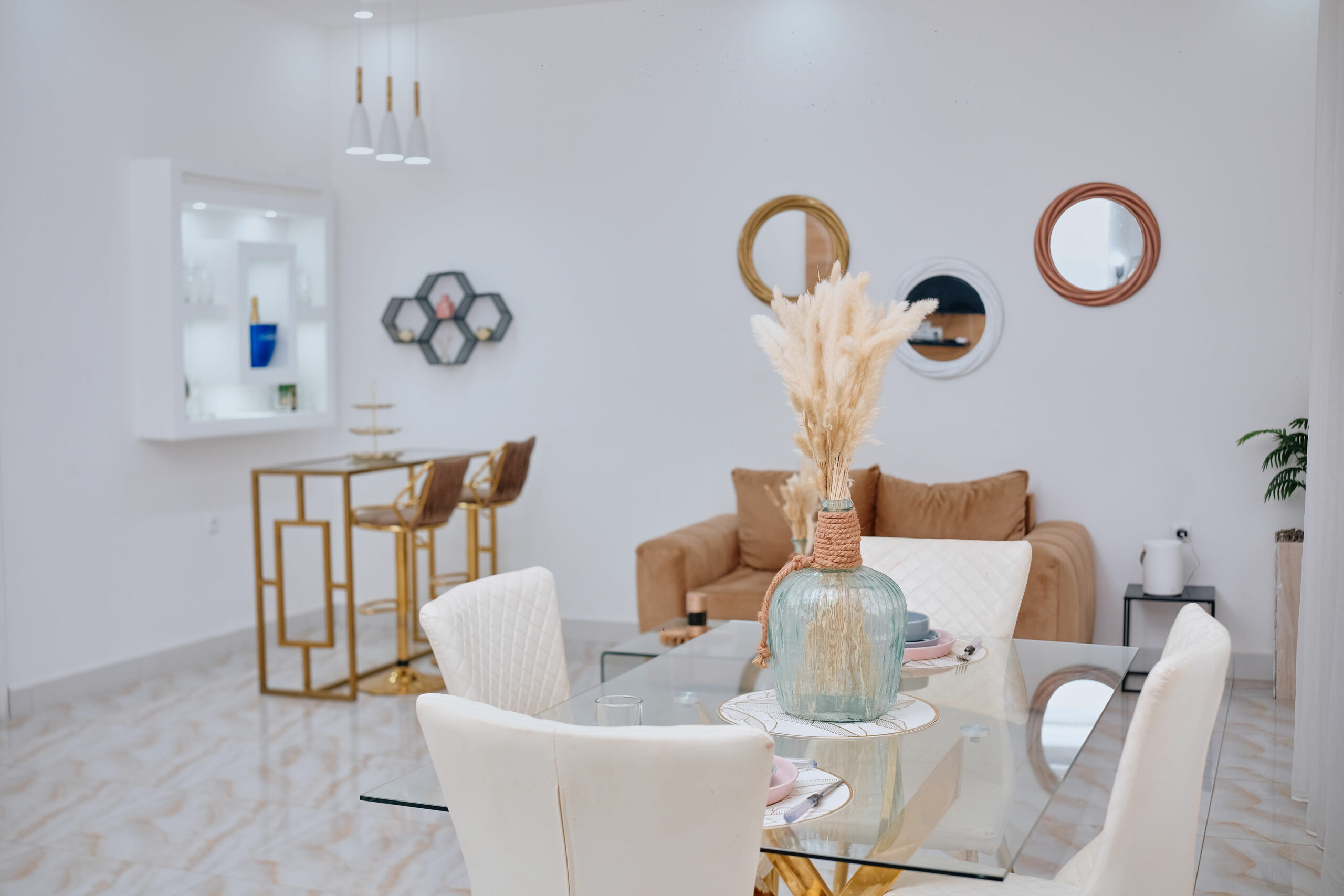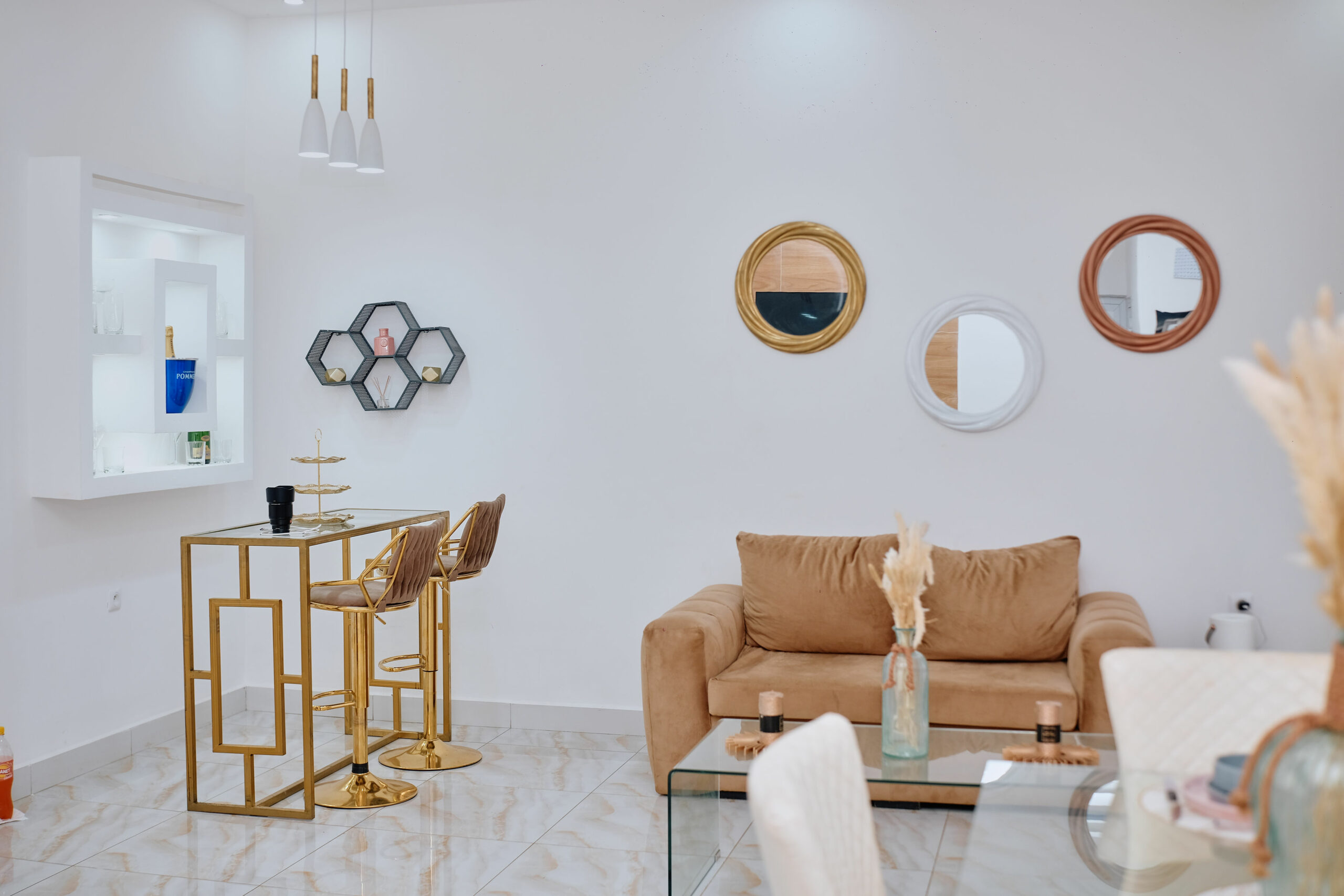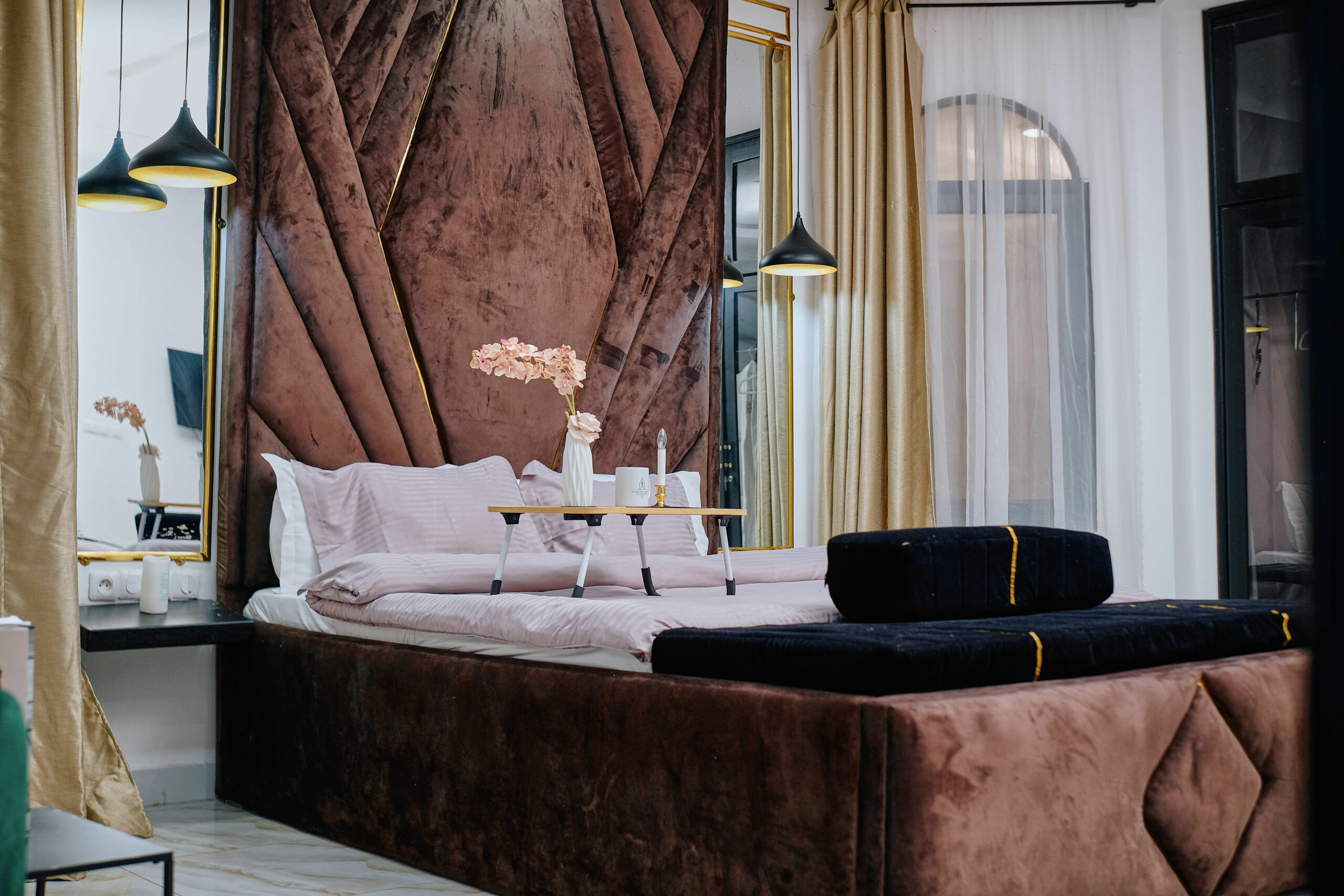 Savourez une expérience inoubliable dans cette suite raffinée. Lit king-size avec tête de lit design, salon chaleureux avec canapé stylisé et TV, cuisine ouverte équipée avec bar, salle de bain sophistiquée. Un espace de vie lumineux et confortable, pensé pour votre détente.Points Forts :